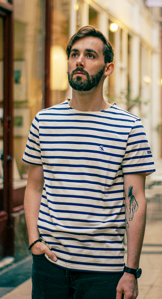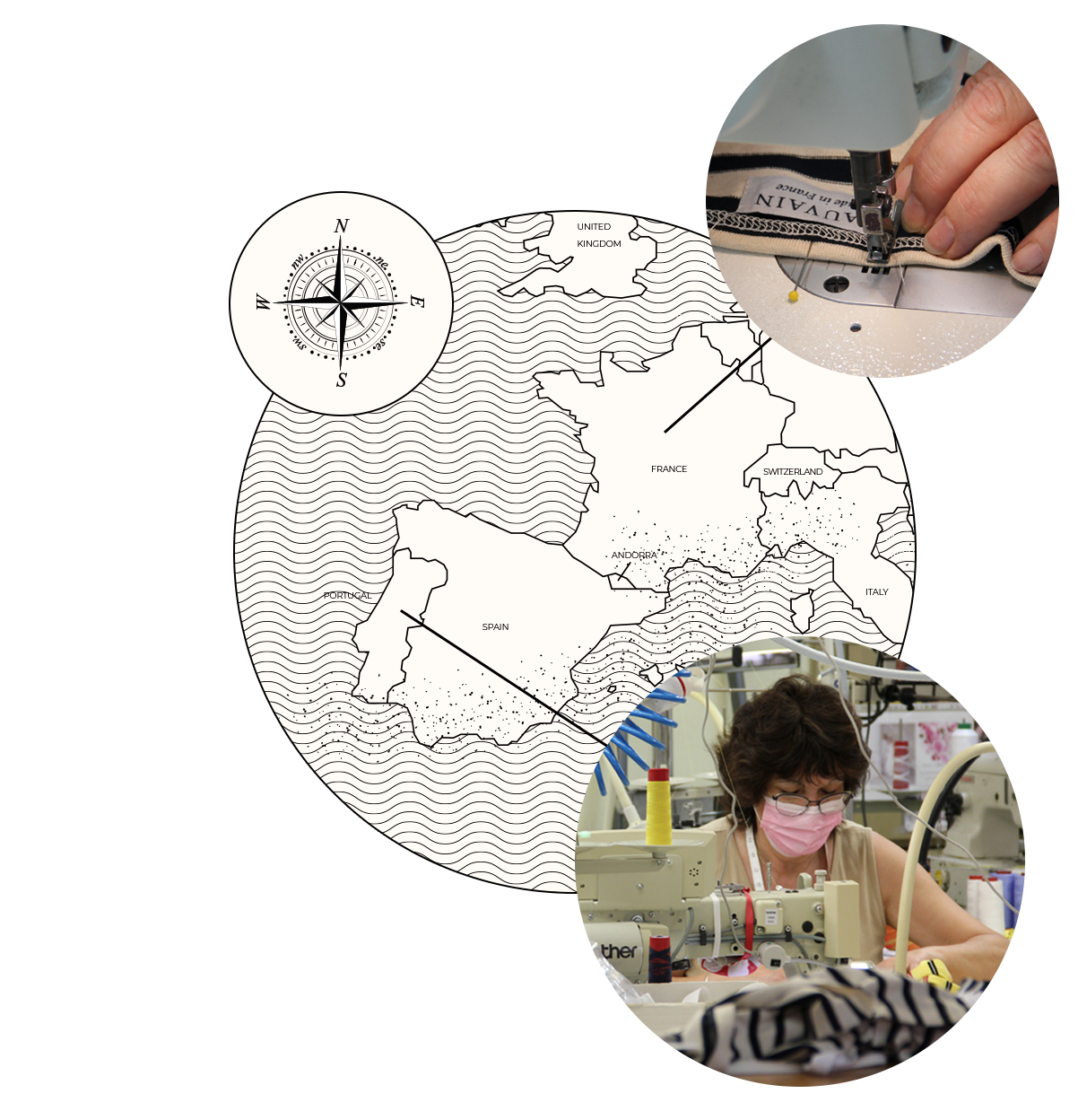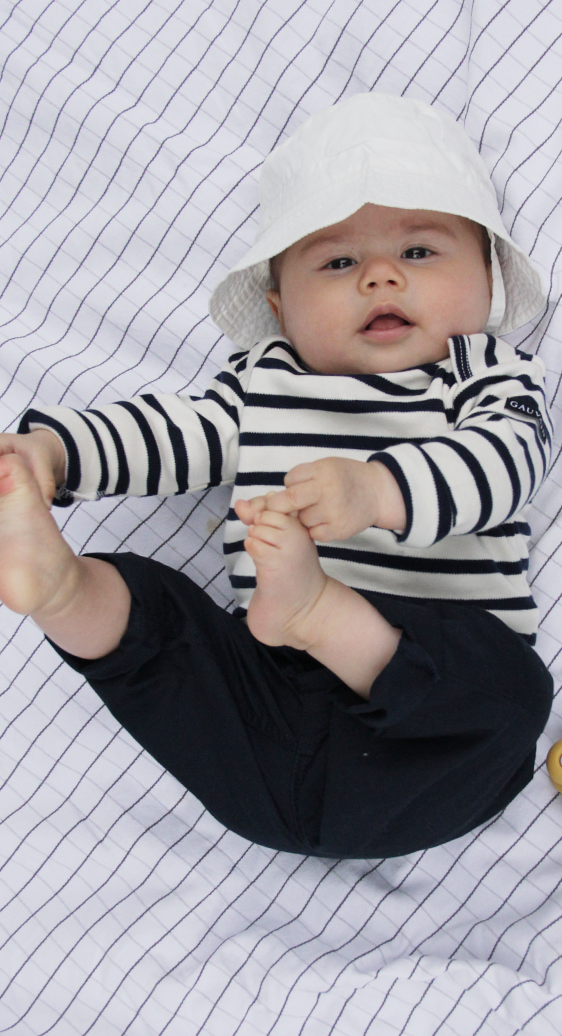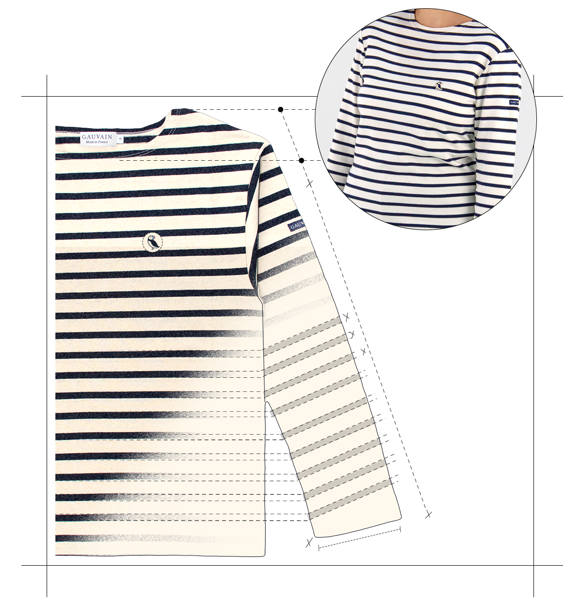El corazón de nuestras marineras es el tricot, una técnica de tejido de punto cerrado y compacto que se realiza en telares circulares o planos. Estos alternan bobinas de hilos de algodón, dando vida a sus icónicas rayas mientras crean una estructura resistente y elástica.